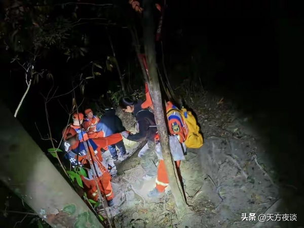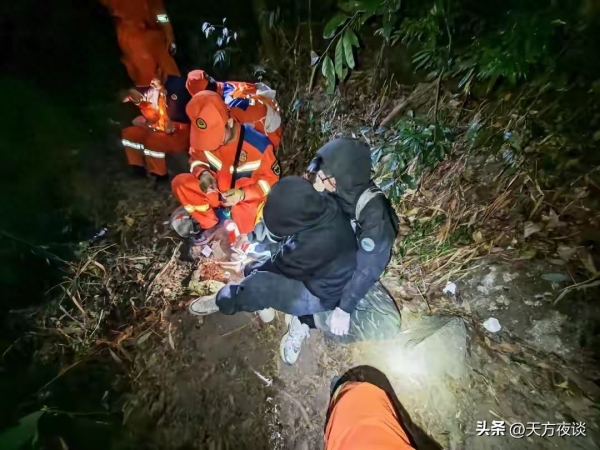 惠州朱明洞消防救援站接到求助,立马派5名消防员带着急救包、葡萄糖、保暖毯火速进山。夜里的野山伸手不见五指,到处是密密麻麻的草木,消防员只能凭着两人说的大概位置,打着手电筒深一脚浅一脚地找,喊叫声在山谷里来回飘。