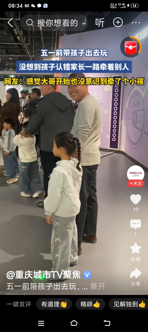 五一前出门游玩,一名小朋友不小心认错家长,一路紧紧牵着陌生路人往前走。