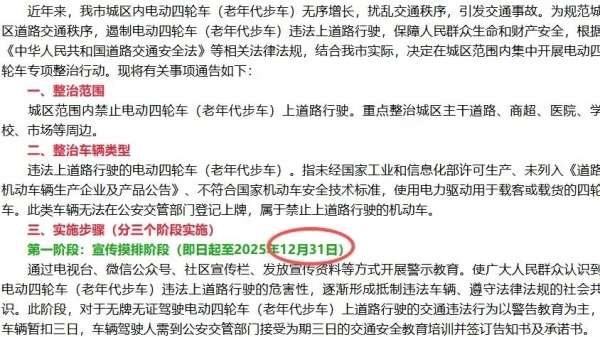 整治行动分三个阶段,第一阶段是在12月31日前,对当地所有无牌无证驾驶电动四轮车(老年代步车)的用户进行警告教育,并查扣车辆三日,车主需需到公安交管部门接受为期三日的交通安全教育培训并签订告知书及承诺书。