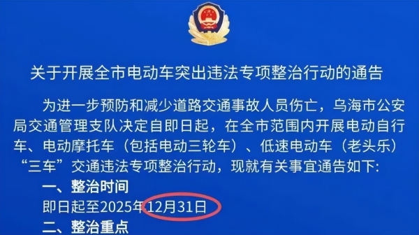 近日, 内蒙古乌海市公安局交通管理支队发布了《关于开展全市电动车突出违法专项整治行动的通告》,截止12月31日前,在全市范围内开展电动自行车、电动摩托车(包括电动三轮车)、低速电动车(老头乐)"三车"交通违法专项整治行动。