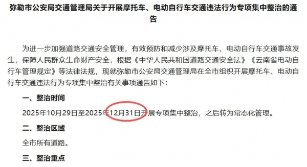 近日,云南省弥勒市公安局交通管理局发布了《关于开展摩托车、电动自行车交通违法行为专项集中整治的通告》,公安交管部门将在12月31日前,在全市组织开展摩托车、电动自行车交通违法行为专项集中整治。