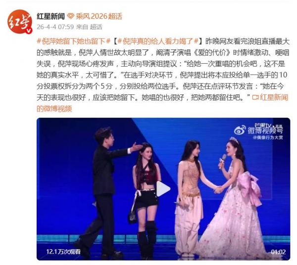 倪萍在《乘风2026》初舞台直播中因"人情味"过浓、屡次干预赛制引发争议后,次日开场直接上演"道歉三连"并宣读保证书,迅速成为4月4日的舆论焦点。