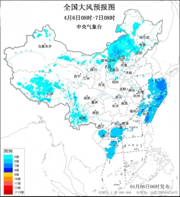 北方方面,6日西北地区东部、内蒙古大部、华北北部和西部、东北多地刮起大风,内蒙古中东部、辽宁、吉林东部等部分地区风力5~7级,阵风7~9级,局地阵风超10级,东海东部等海域也有7~8级大风。