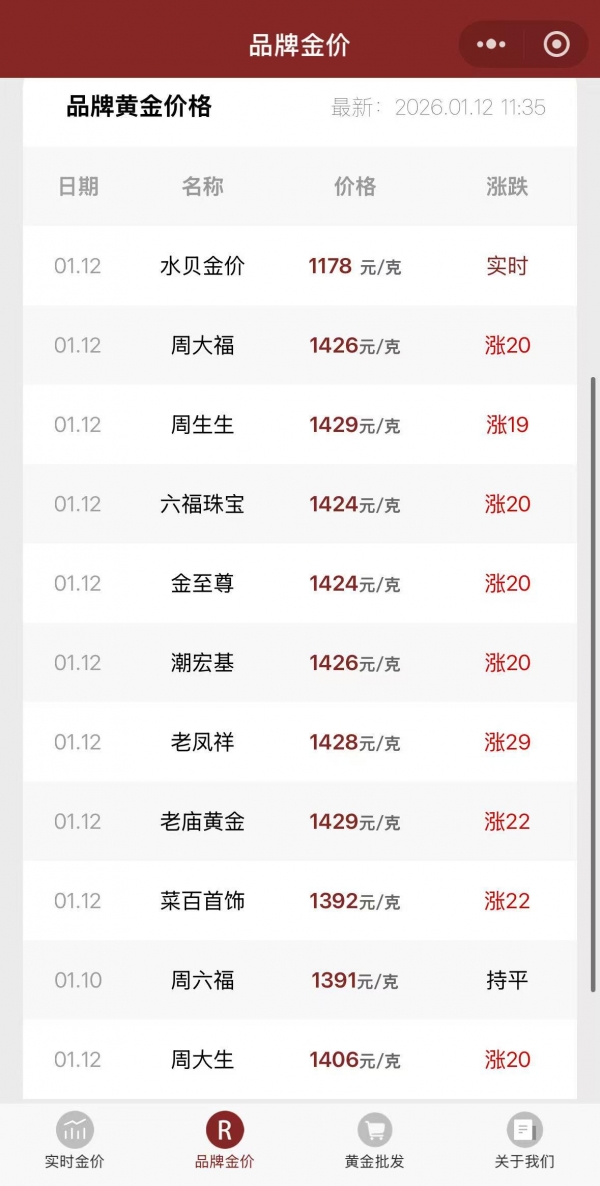 国际金价走高,国内黄金饰品价格也随之走强。据今日金价小程序,1月12日,国内多家品牌足金首饰克价较上一日大幅上涨,多数站上1420-1430元/克。其中,老庙黄金金饰克价较上一日上涨22元,报1429元/克。老凤祥较日前上涨29元/克,报1428元/克。此外,周大福、潮宏基、周生生等金饰克价均超过1425元,叫日前上涨20元/克左右。