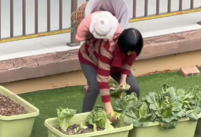老人没有任何防护措施,直接站在顶棚,顶棚上种了点蔬菜,老人正弯着腰摘菜,她一弯腰背上的孩子就往下掉,孩子没有绑带,就装在背篓里,老人弯腰幅度只要大一点孩子一定摔下楼!