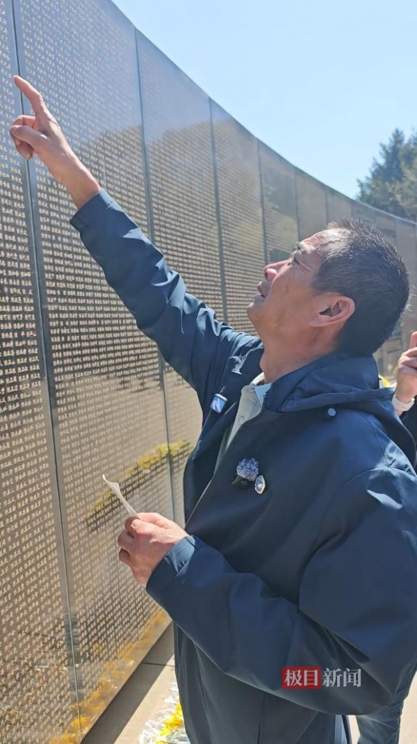 仪式结束后,来自浙江衢州的烈士家属陈春富在陵园烈士英名墙上找到他大伯陈文元的名字后,下跪致敬。"大伯,这束花献给你,带你回家了。"陈春富眼眶逐渐湿润。