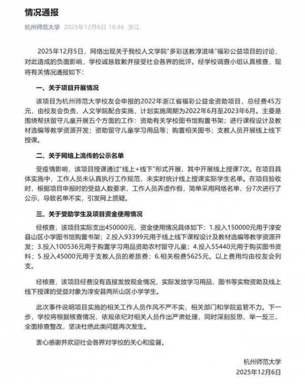 2025年12月5日,网络出现关于我校人文学院"多彩送教淳滋味"福彩公益项目的讨论,对此造成的负面影响,学校诚恳致歉并接受社会各界的批评。经学校调查小组认真核查,现将有关情况通报如下: