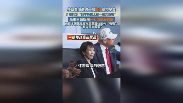 特朗普向讲台下的驻日美军士兵介绍高市早苗,称她是"胜者""日本首位女首相",并大力称赞日美同盟。特朗普说完后,满脸笑容的高市早苗挥动着右手,身体转动一圈向在场人员打招呼。