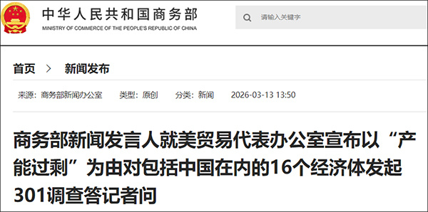 据商务部网站3月13日消息,商务部新闻发言人就美贸易代表办公室宣布以"产能过剩"为由对包括中国在内的16个经济体发起301调查答记者问。