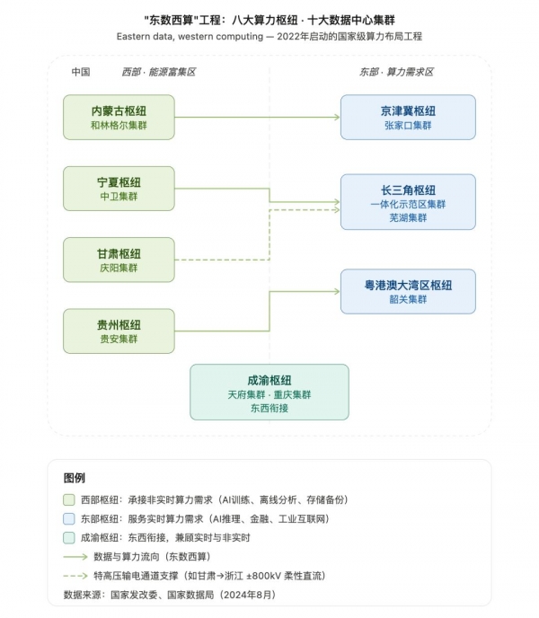 2022 年启动的"东数西算"工程,则是在全国布局八个国家算力枢纽节点和十个国家数据中心集群。它把东部的数据和算力需求,引导到西部能源更充沛、土地和电力成本更低的区域承接。它提供的也不是简单的"机房西迁",而是一套把能源、网络、数据中心和时延要求放进同一调度框架的组织能力。