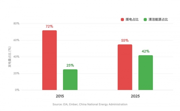 2015 年,煤电仍占中国发电量的约 72%。到 2025 年,这一比例降至约 55%。