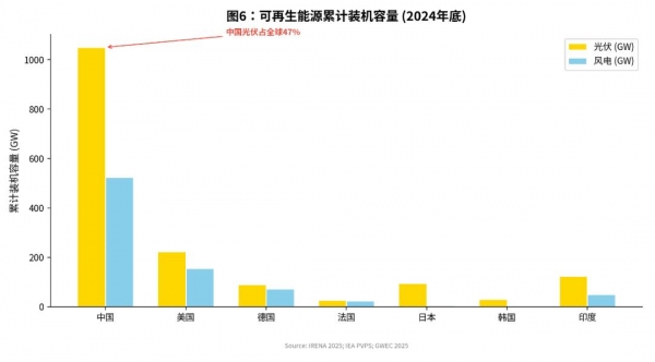 (图:可再生能源累计装机容量(2024年底);数据来源: IRENA 2025; IEA PVPS Snapshot 2025; GWEC Global Wind Report 2025;制图:Claude)