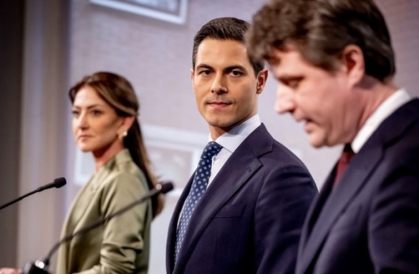 当地时间1月30日,荷兰D66党魁罗布·耶滕(中)、自民党领袖迪兰·耶希尔戈兹与基民盟领导人亨利·邦滕巴尔共同公布名为《启动》的联合执政协议,三党宣布将组建少数派内阁。东方IC