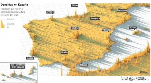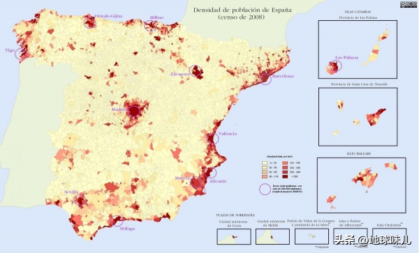 也多亏了西班牙是个散装国家,才能承接这么多游客,毕竟查看西班牙的人口密度图就会发现,西班牙的大城市就像是一座座孤岛,被淹没在了西班牙国土的海洋里,而且彼此仿佛互相嫌弃一般,离得非常远。