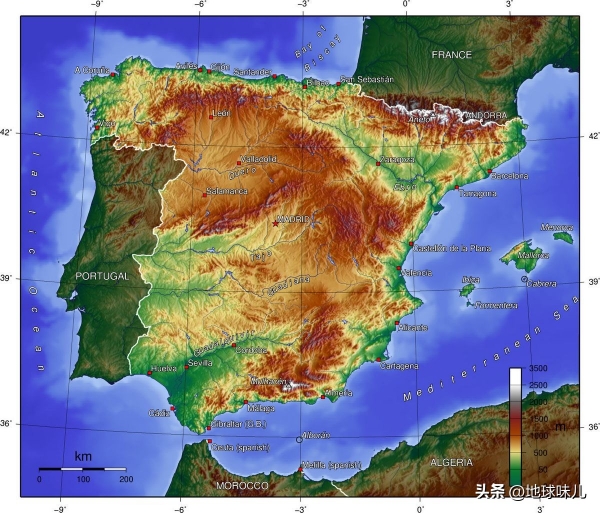 西班牙是一个典型的山地国家,境内高原和山地非常多,比如中央高原、坎塔布连山脉、伊比利亚山脉、比利牛斯山脉、莫雷纳山脉和安达卢西亚山脉等,而好不容易伊比利亚半岛西部有一块比较平坦的土地,还全在葡萄牙手中,结果西班牙成了全欧洲地势最高的国家之一,平均海拔达到了约700米,远超平均约372米的葡萄牙和平均约375米的法国。