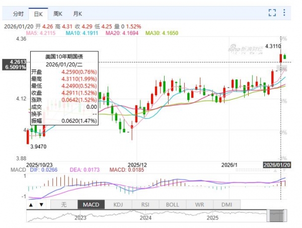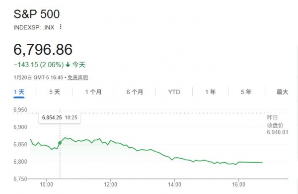 1月20日,美国三大指数集体收跌,道指狂泄近900点,标普500指数和纳指重挫逾2%。其中,标普500指数不仅抹去了今年以来的全部涨幅,更创下三个多月来的最大单日跌幅。衡量市场恐慌程度的VIX指数飙升至去年11月以来最高水平。与此同时,避险情绪推动黄金价格突破每盎司4700美元的历史新高;美元指数下跌0.41%。1月21日,黄金再创新高,首次站上每盎司4800美元关口。