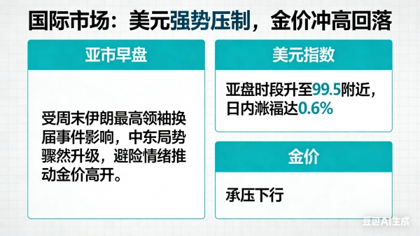 从国际盘面来看,今日金价走出了"过山车"行情。亚市早盘,受周末伊朗最高领袖换届事件影响,中东局势骤然升级,避险情绪一度推动金价高开。然而,随后市场逻辑迅速切换,美元指数在亚盘时段升至99.5附近,日内涨幅达0.6%,强劲的美元使得以美元计价的黄金对海外买家而言成本大增,导致金价承压下行 。