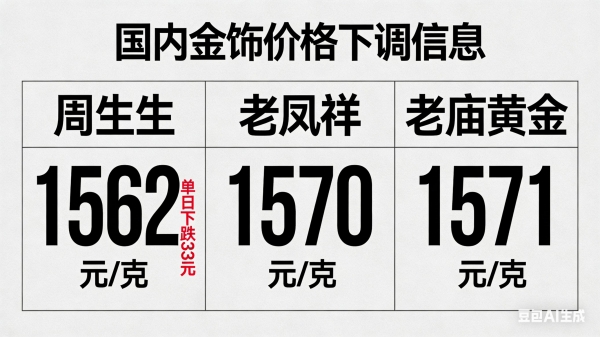 受国际金价跳水波及,国内品牌金店的足金饰品价格也迎来了近期较大力度的调整。数据显示,周生生金饰今日报价为1562元/克,单日下跌33元;老凤祥和老庙黄金也分别下调至1570元/克和1571元/克,单日跌幅在12元至13元不等 。