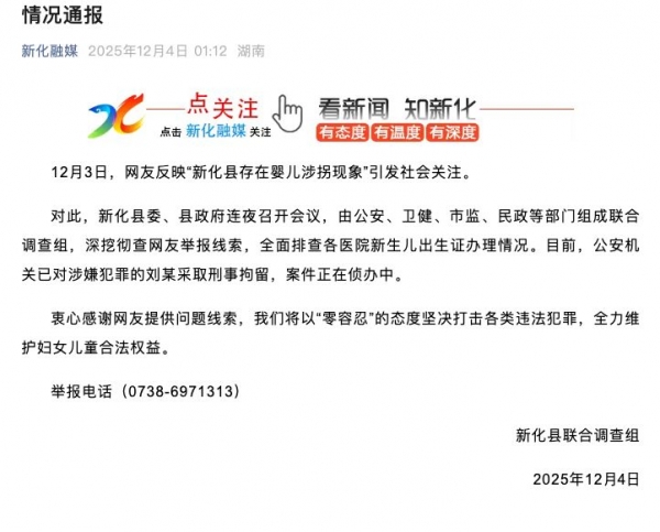 12月3日,网友反映"新化县存在婴儿涉拐现象"引发社会关注。
