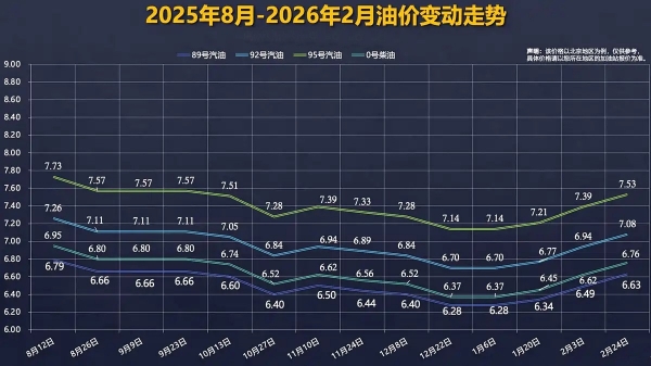 据最新信息透露:新一轮成品油调价窗口将于3月9日24时开启,3月6日,布伦特原油价格上涨对应国内第9个工作日参考原油变化率11.35%,机构预测,汽柴油价格将上调500元/吨,折升价92号汽油、95号汽油、0号柴油分别上调0.39元、0.41元、0.42元,或为年内最大涨幅。