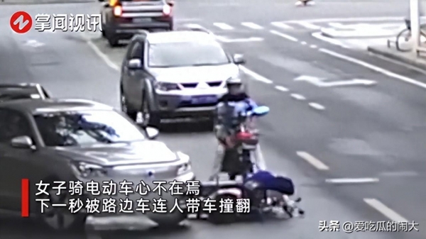 这事儿可真够倒霉的。就那么一晃神,骑车的小姐姐就被路边的车给撞了。你说说,这得多疼啊!可这还没完呢,刚站起来,又来一撞,这运气也太背了吧!