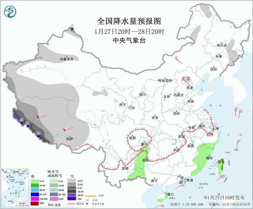 我国综合性给出的雨雪过程来看,其青藏高原东部、西北地区东部、华北、黄淮西部和南部、江汉、江淮、江南西部等地有小雪或雨夹雪,其中陕西、山西、河南等地部分地区有中到大雪,局地暴雪,湖北西部、湖南西部及贵州东部等地局地有冻雨,西南地区东部、江南、华南等地有小到中雨。