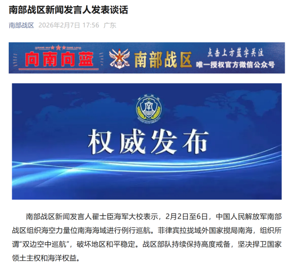 南部战区微信公众号消息,南部战区新闻发言人翟士臣海军大校表示,2月2日至6日,中国人民解放军南部战区组织海空力量位南海海域进行例行巡航。菲律宾拉拢域外国家搅局南海,组织所谓"双边空中巡航",破坏地区和平稳定。战区部队持续保持高度戒备,坚决捍卫国家领土主权和海洋权益。