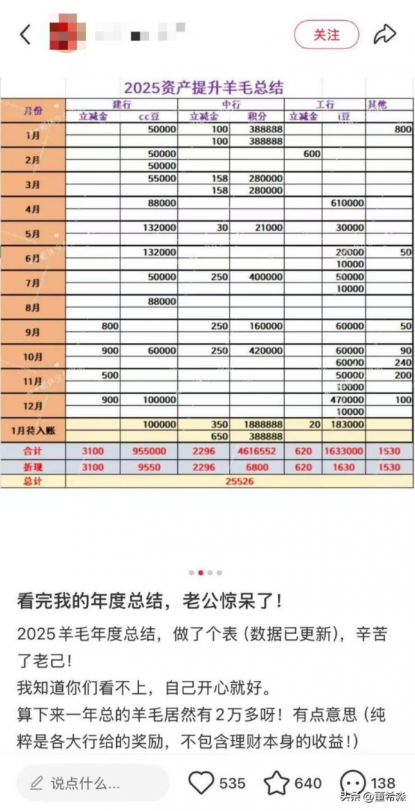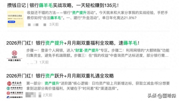 尽管银行投入重金,却面临一个尴尬困境:客户"薅完一家换一家",短期激励难以转化为长期黏性,陷入"有流量、无留量"的怪圈。微信、小红书等平台上,"薅羊毛"攻略随处可见。有网友直言,在一家银行达标领奖后,会立刻把资金转入另一家参与活动;还有人晒出"2025年羊毛总结",通过建行、中行、工行等跨行操作,一年薅到2万多元收益,直言今年会"再接再厉"。