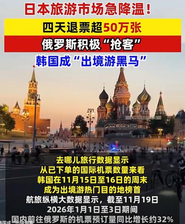 航旅纵横提供的数据显示,截至11月19日,2026年1月1日至1月3日国内前往俄罗斯的机票预订量同比增长约32%。