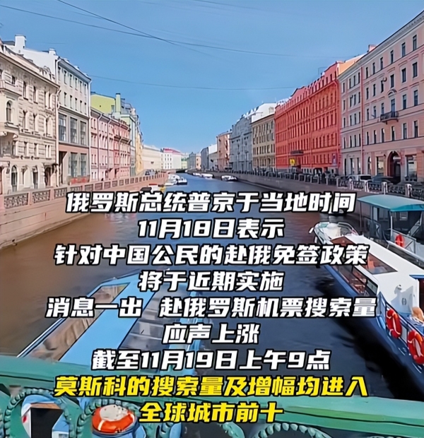 免签政策即将生效的消息一经发布,就在中国旅游市场激起了巨大的涟漪,最直接的反应就是赴俄机票搜索量的"断崖式暴涨"。