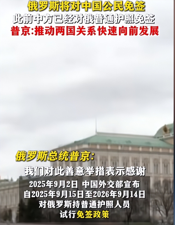 2025年9月2日中国外交部正式对外宣布,为进一步便利中外人员往来,对俄罗斯持普通护照人员试行免签政策。