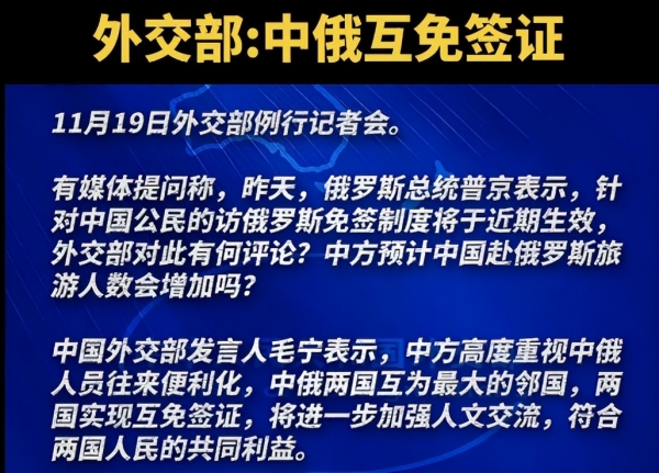 在俄罗斯宣布免签政策即将生效、中国赴俄旅游热度飙升的背景下,11月19日中国外交部发言人毛宁在例行记者会上回应了相关问题。