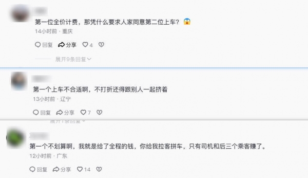 不少网友对此表示不解:"第一位乘客全价计费,那凭什么要求人家同意第二位上车?""第一位乘客太冤,包车的钱,享受拼车待遇。"