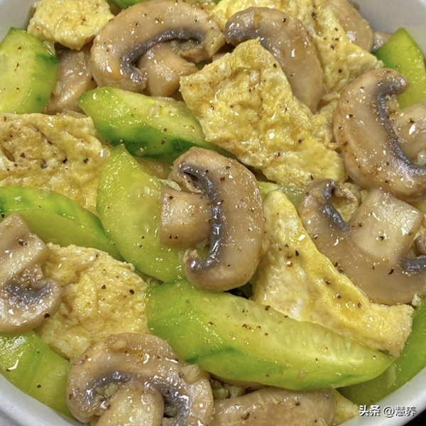 - 余油爆香蒜末,下口蘑炒软,加入黄瓜片翻炒1分钟。