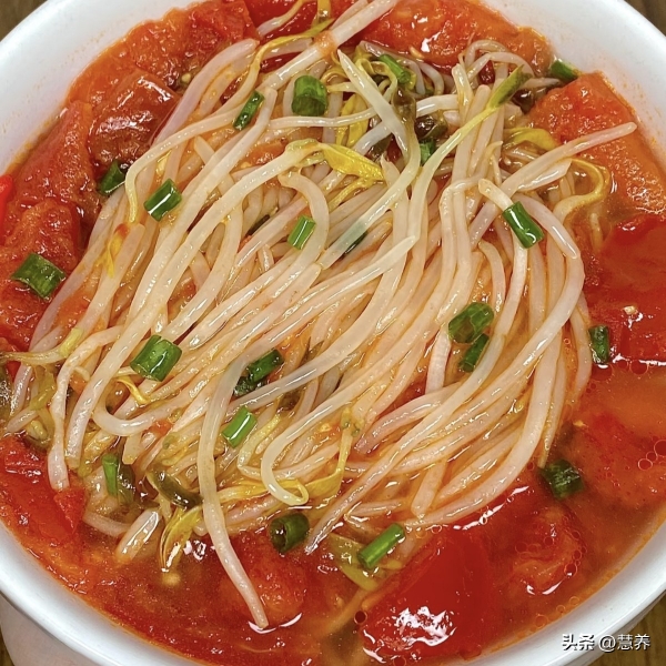食材: 番茄、绿豆芽、葱花、盐、香油