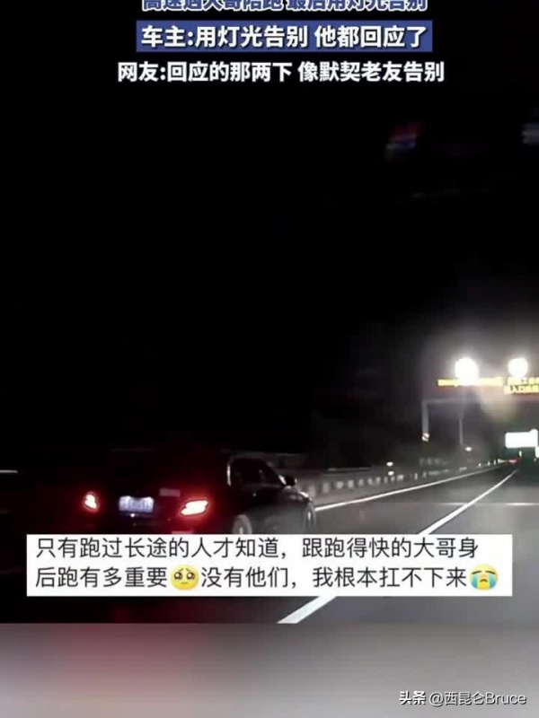 短暂的交流后,两人再次上路。不久后周先生先到达目的地,驶下高速。分别时,大哥打灯示意告别,周先生表示"分开的时候真的非常不舍"。