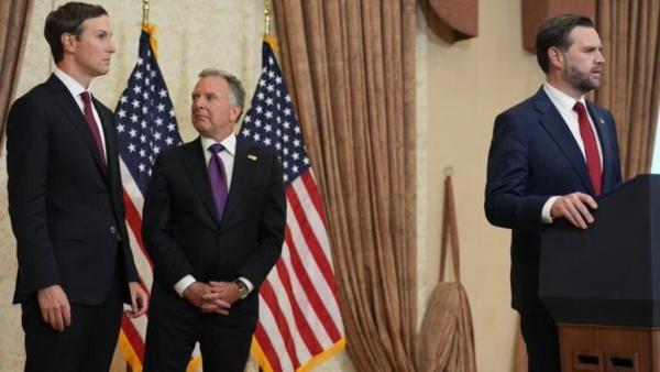 4月12日,巴基斯坦伊斯兰堡,美国副总统万斯(右)在与伊朗代表谈判后举行新闻发布会并发表讲话,特朗普女婿库什纳(左)和特使史蒂夫·维特科夫在一旁聆听。美联社
