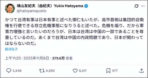 这意味着高市眼下不仅公然涉足中国台海相关议题,甚至为日本可能介入该议题预先编造了所谓"理由"。