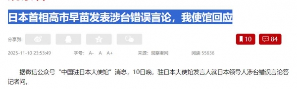 其次,高市上台不到一个月,屡次炒作台湾议题,刻意塑造的"强硬派"形象在极短时间内即告瓦解,此举深刻揭露了极右翼政客的投机本质与虚伪面目,他们惯于操弄"台湾牌"以谋取私利,却缺乏承担相应后果的勇气与担当。
