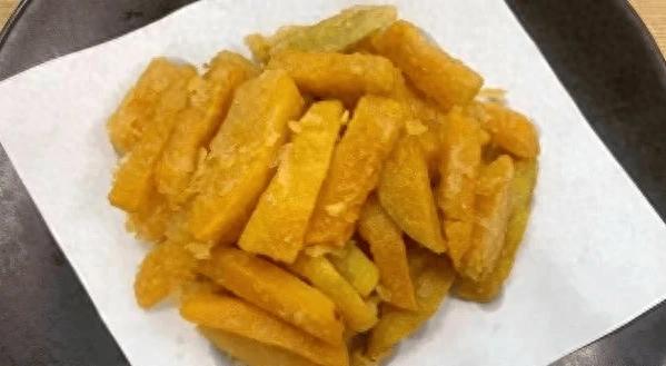 4. 锅中倒油烧至五成热,分批放入南瓜块炸至金黄酥脆,捞出控油。