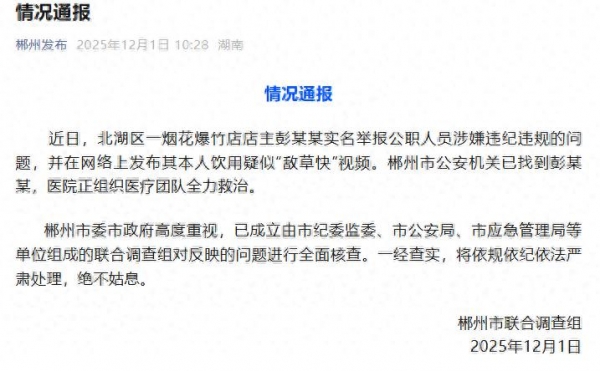 近日,北湖区一烟花爆竹店店主彭某某实名举报公职人员涉嫌违纪违规的问题,并在网络上发布其本人饮用疑似"敌草快"视频。郴州市公安机关已找到彭某某,医院正组织医疗团队全力救治。