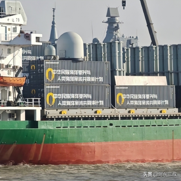 特别值得注意的是,虽然安装了大量武器装备,但该船似乎特别"高调"并不在意外界想法。集装箱上涂刷了各种标语,比如"中华民族海洋复兴与人类海洋命运共同体计划",因此刚开始有人猜测会不会是电影道具,但认真观察分析后觉得"道具"太逼真了。各种迹象表明,这就是一艘集装箱导弹船,用来验证如何快速将民船改为军舰,对于造船吨位占世界一半以上的大国来说,这可不是开玩笑而是具有极为重要的现实意义。