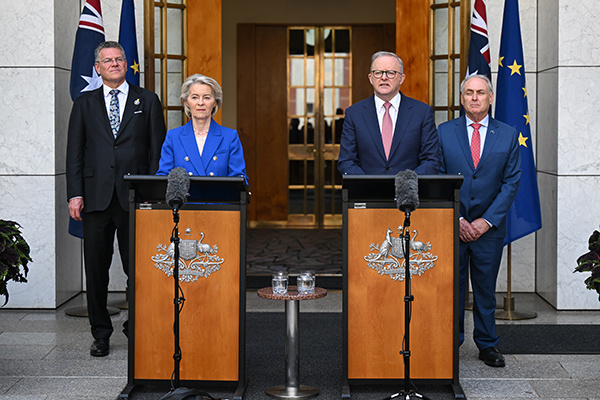 当地时间24日,欧盟委员会主席冯德莱恩与澳大利亚总理阿尔巴尼斯出席记者会,共同宣布达成自由贸易协议。这项历时八年达成的协议,将取消双方对彼此商品征收的大部分关税,并使欧盟能够更大程度地获取来自澳大利亚的关键矿产供应。