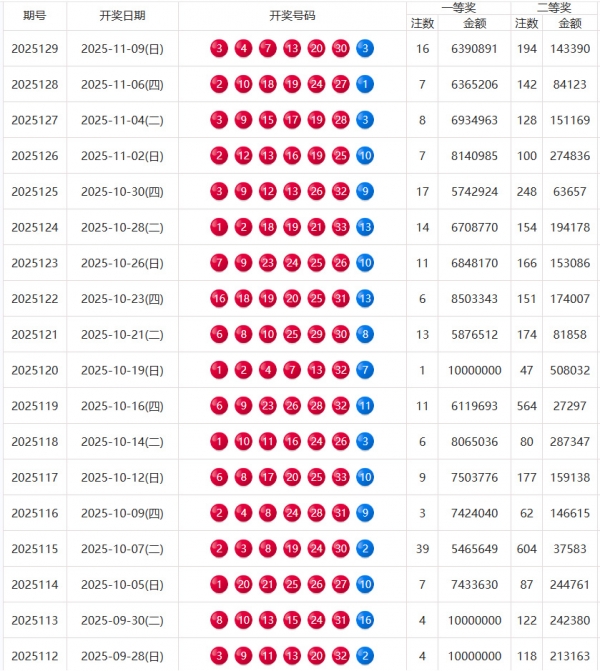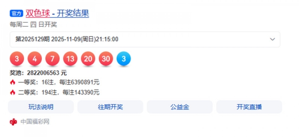 双色球第2025129期开奖号码:03、04、07、13、20、30+03