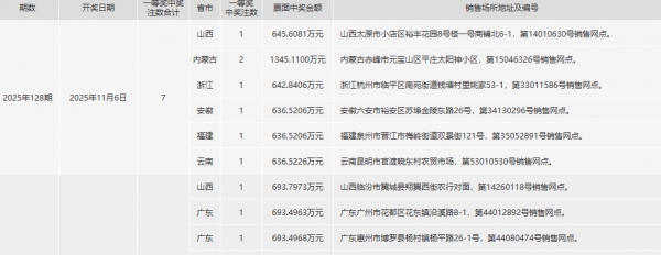 天津1注,河北6注,山西1注,江苏2注,山东1注,湖北1注,广东2注,青海1注,深圳1注,共16注。