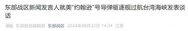 8月22日,东部战区新闻发言人李熹海军大校表示,美"约翰逊"号导弹驱逐舰当日过航台湾海峡并公开炒作。中国人民解放军东部战区组织海空兵力对美舰过航行动全程跟监警戒,依法依规处置。战区部队时刻保持高度戒备,坚决捍卫国家主权安全和地区和平稳定。