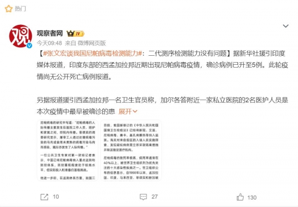 而张文宏也指出:目前对于尼帕病毒检测能力,二代测序检测能力没有问题。