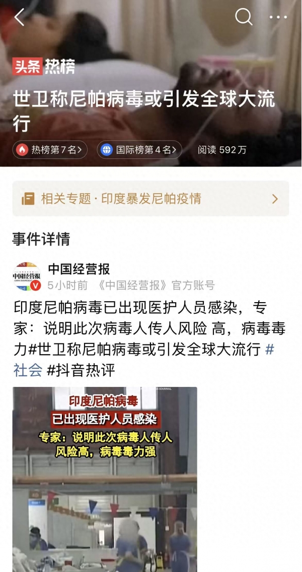 其三,现在在全球,除了中国、泰国、尼泊尔等亚洲国家之外,其他国家似乎并不是特别关注印度尼帕病毒的传播,很多国家并没有升级机场筛查机制,这位印度可能存在的潜在感染者出国进入到其他国家创造了条件。