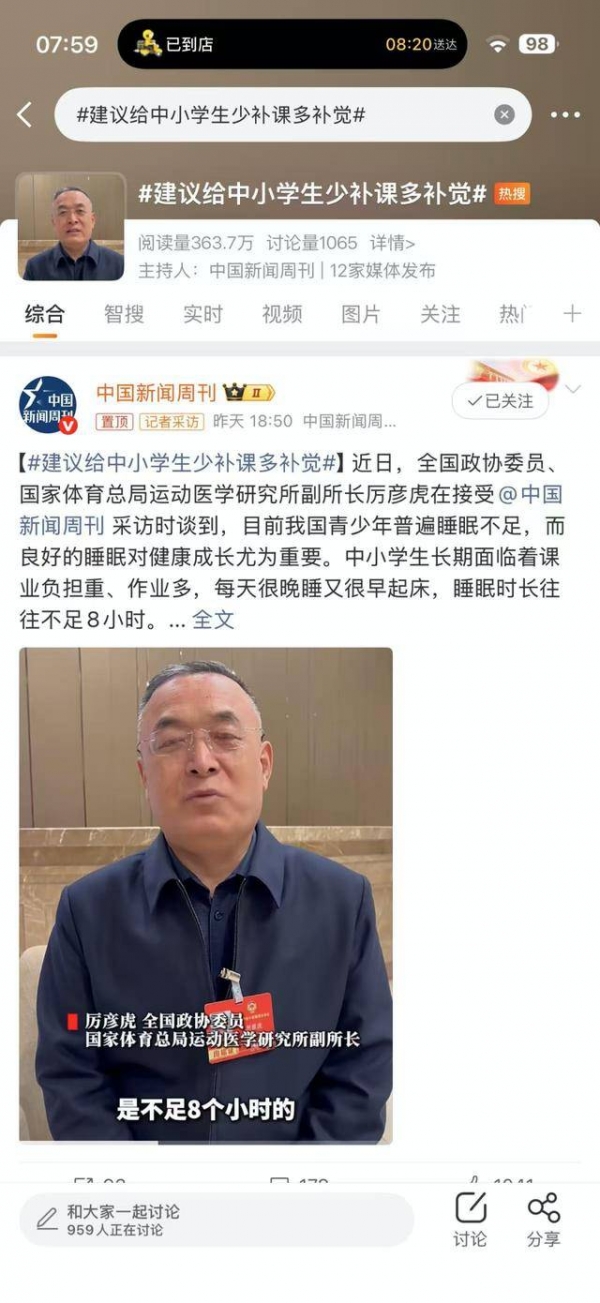 近日,全国政协委员、国家体育总局运动医学研究所副所长厉彦虎在接受中国新闻周刊采访时谈到,目前我国青少年普遍睡眠不足,而良好的睡眠对健康成长尤为重要。