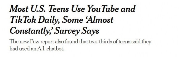 根据《纽约时报》本周二的一篇报道,大多数美国青少年每天都在刷Youtube和Tiktok,有些青少年甚至"几乎时时刻刻都在刷"。